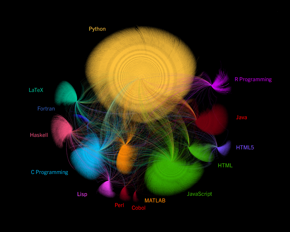 One of our hypotheses was about cross-posting between subreddits based on the nature of the language. For example, HTML and JavaScript are often used together for front-end web-design, so it would make sense that there would be shared users here.